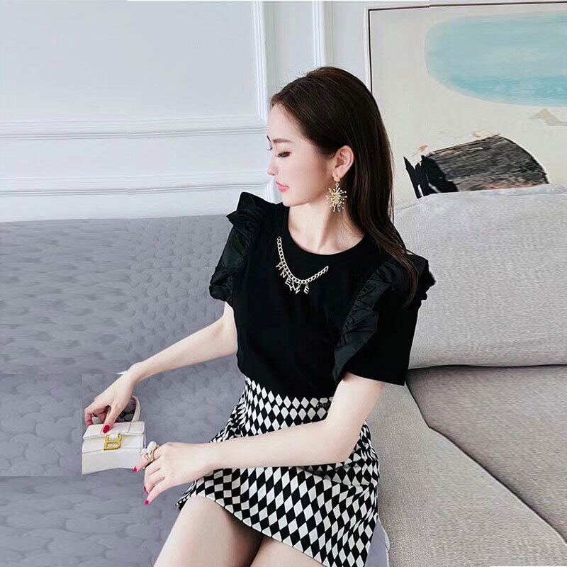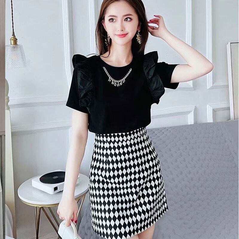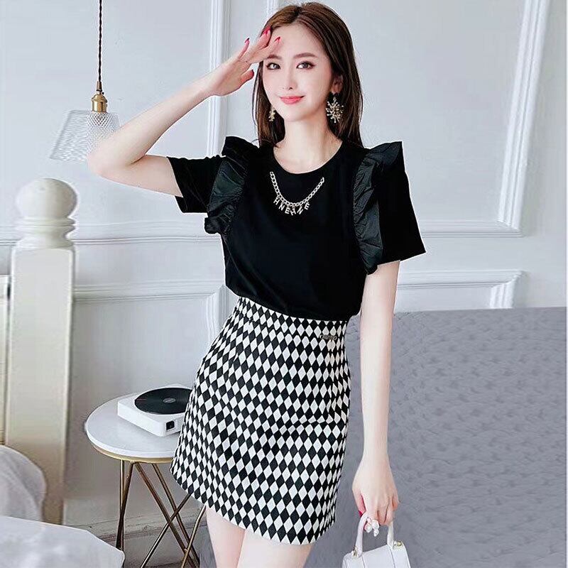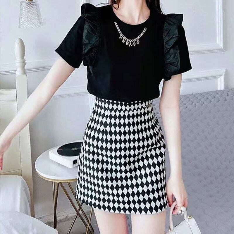 フレンチ袖デザイン感Tシャツ&チェック柄スカートセットアップ【DL-2919】