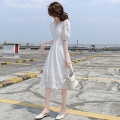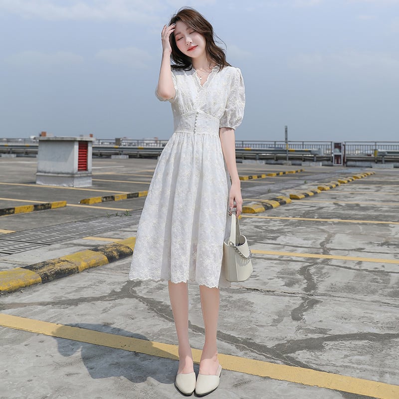 フランスファッション花柄レースフリル裾Vネックデートワンピース【DL-2924】