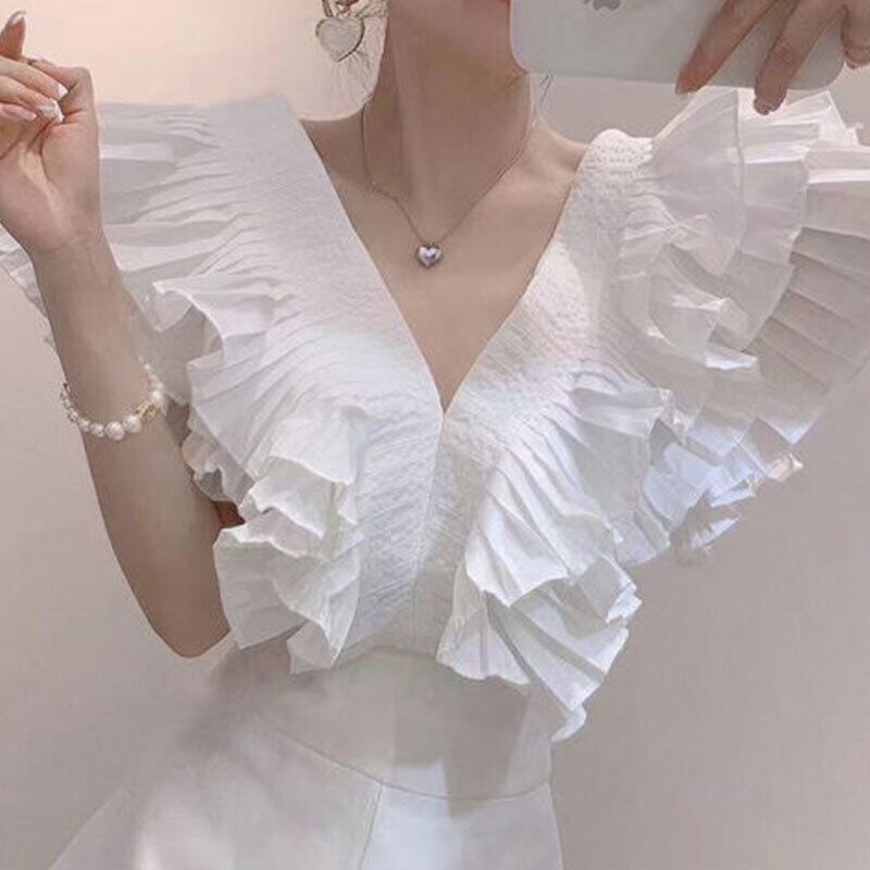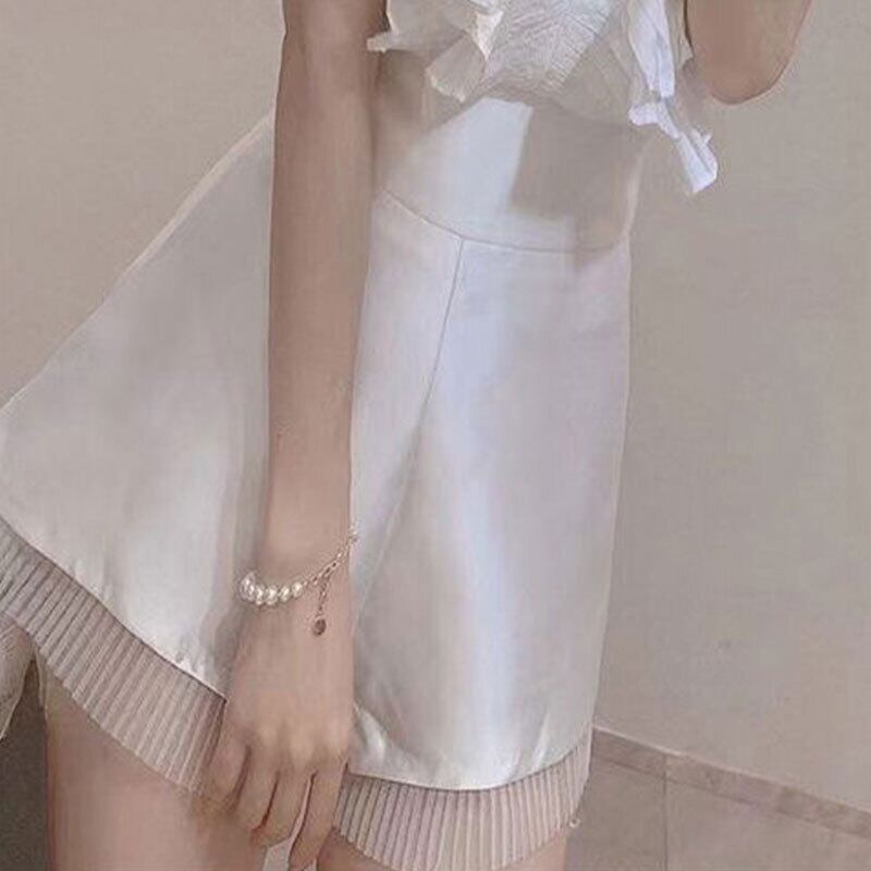 Vネックフリル裾ホワイトシャツ·ブラウストップス&ショーツセットアップ【DL-2931】