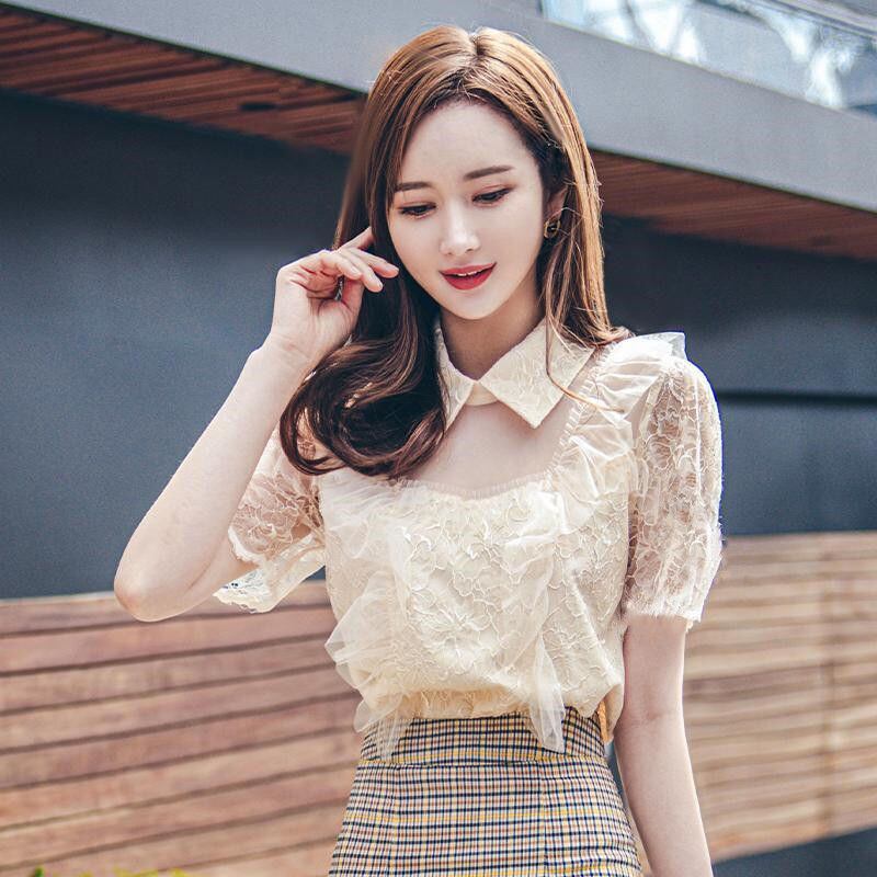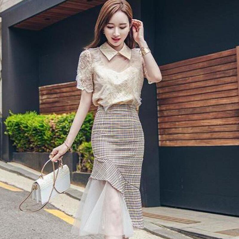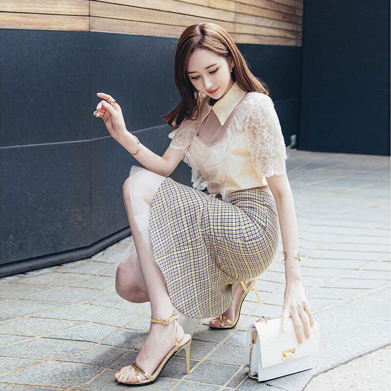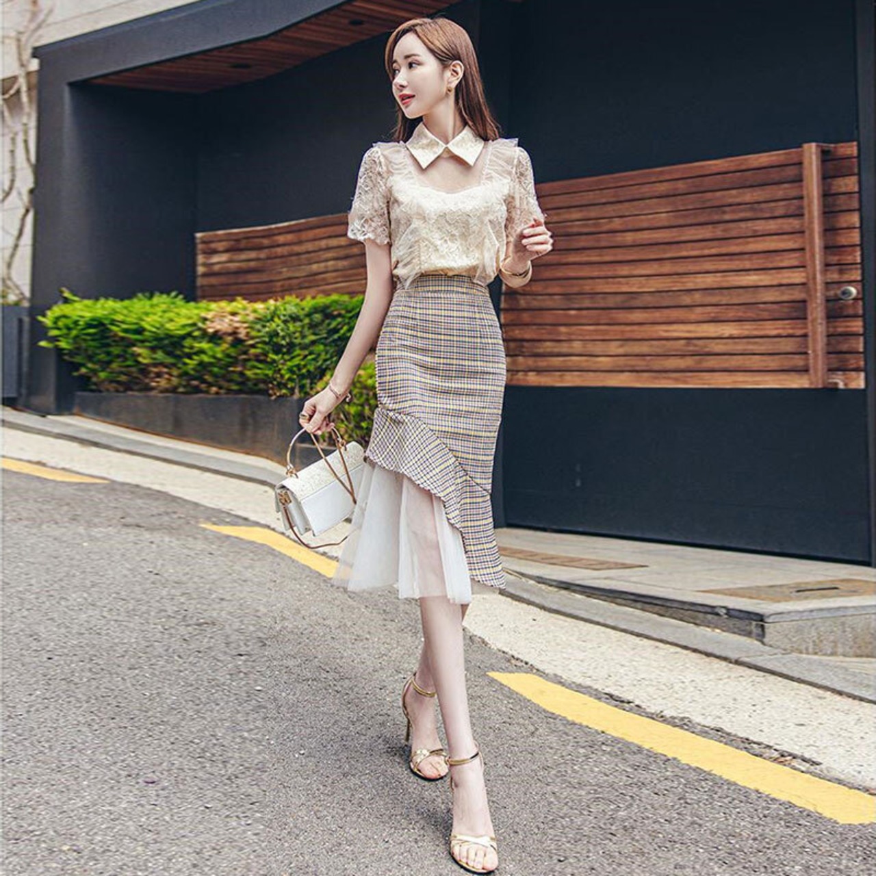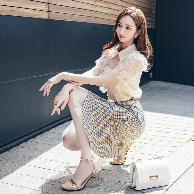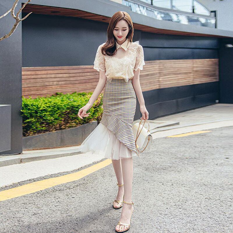 シフォン花柄レース切り替えシャツ·ブラウス&デザイン感スカートセットアップ【DL-2937】