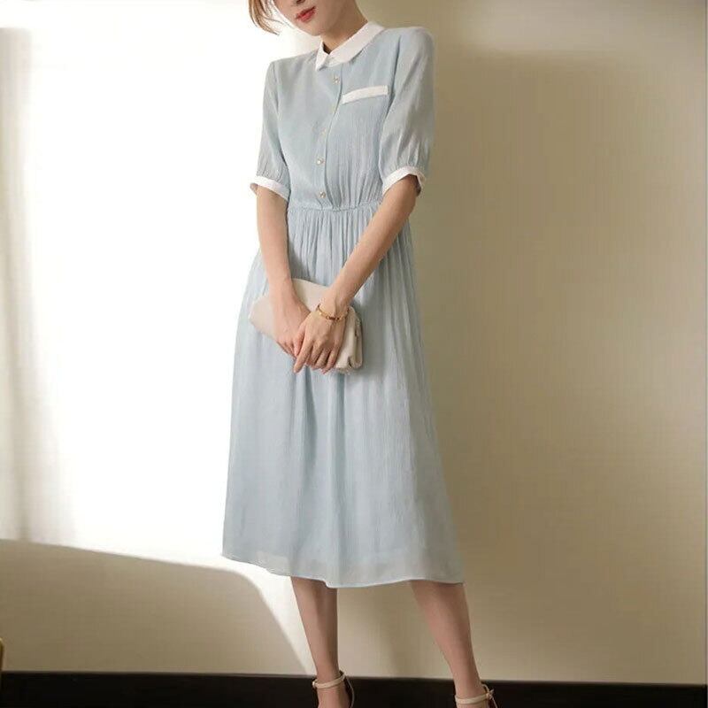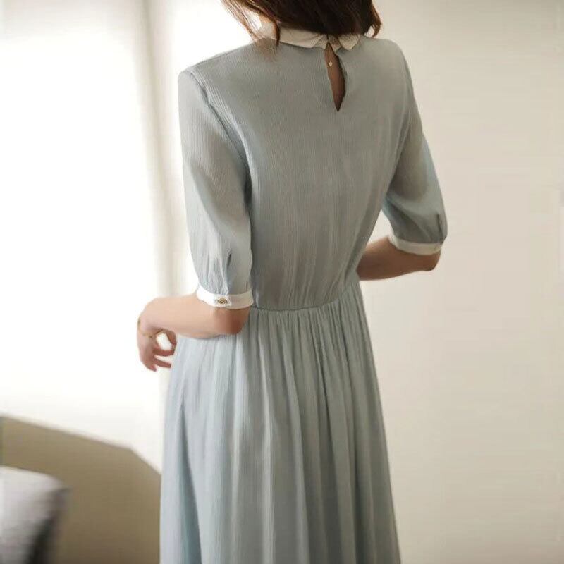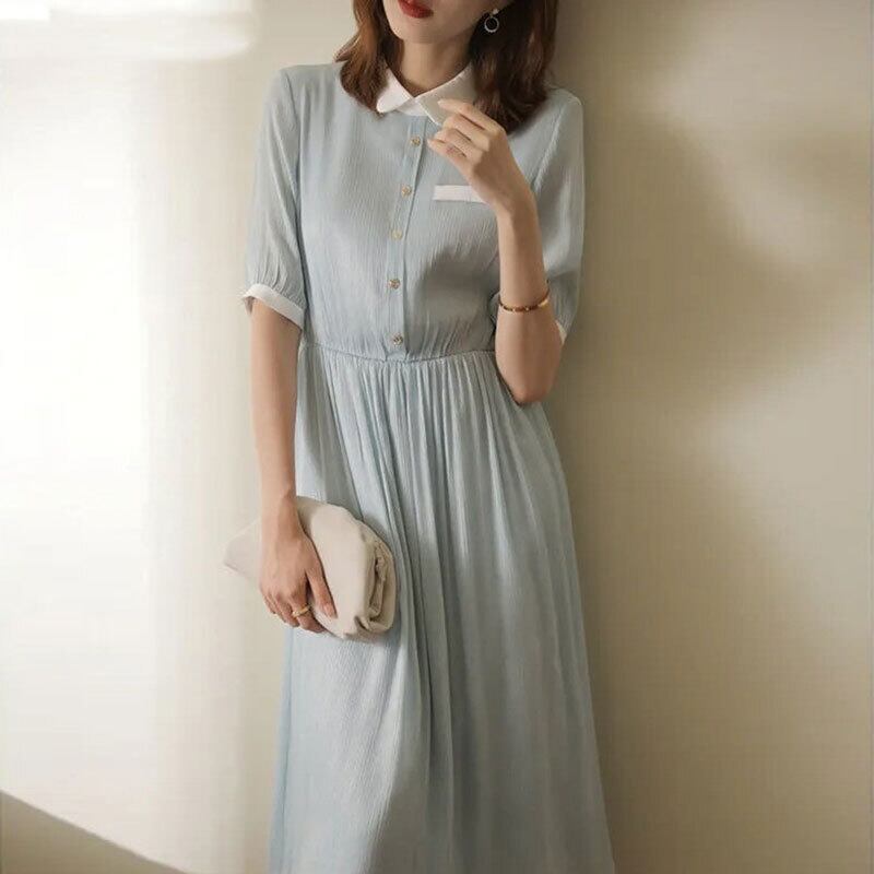 ブルー無地ロングAラインデートワンピース【DL-2939】