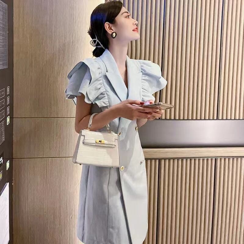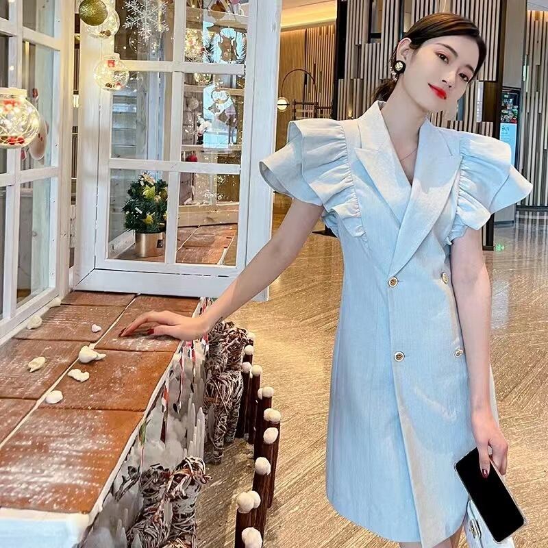 フリル裾ブルー無地気質スーツデートワンピース【DL-2971】