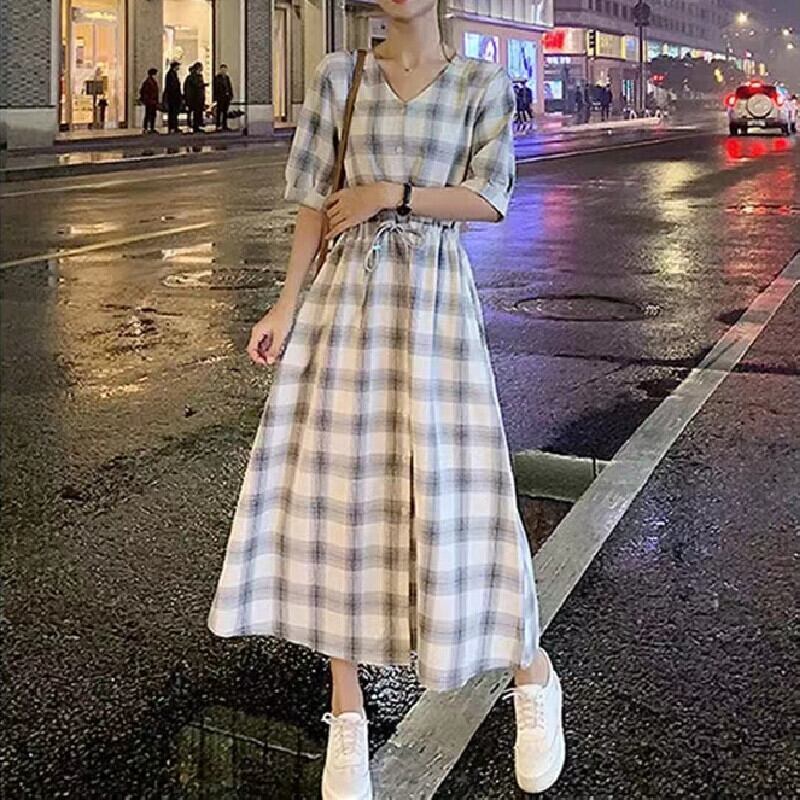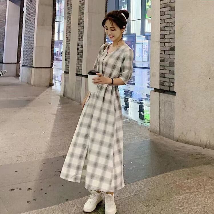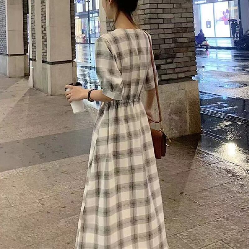 レトロデザイン感ファッションチェック柄ロングデートワンピース【DL-2973】