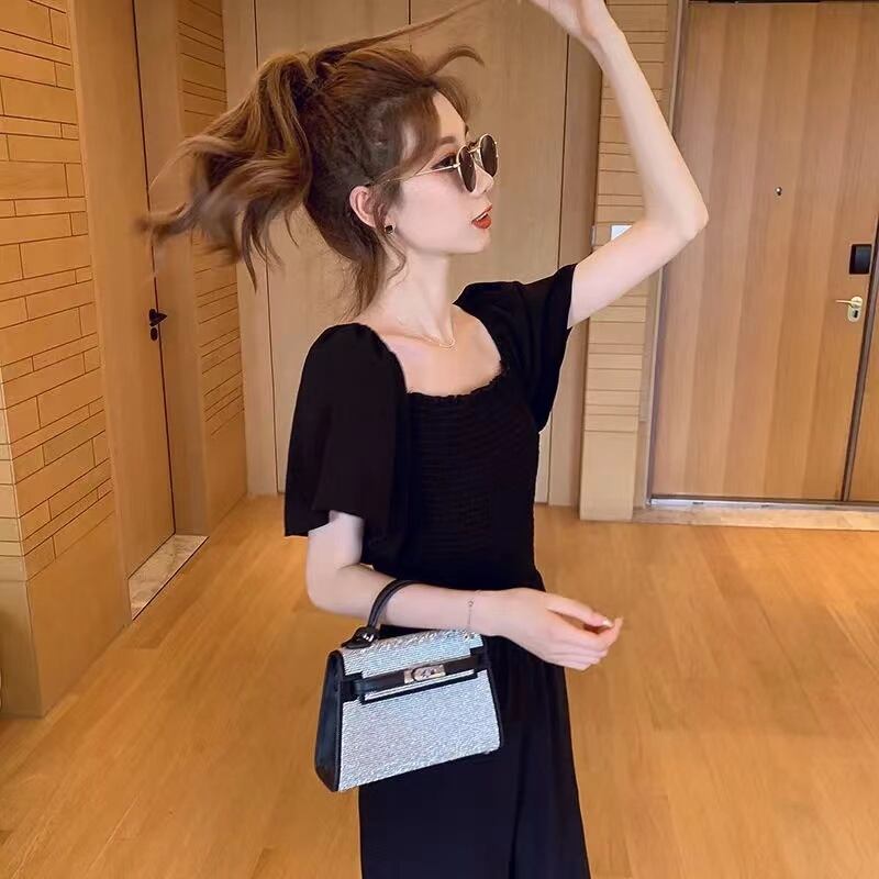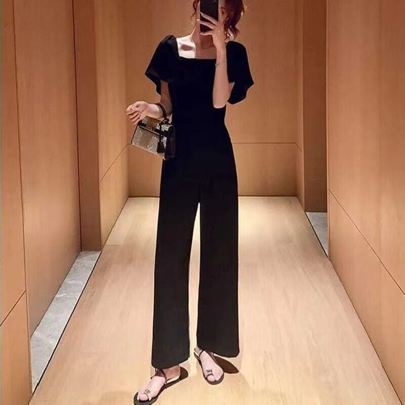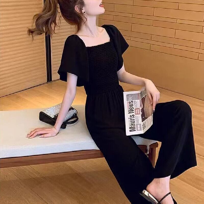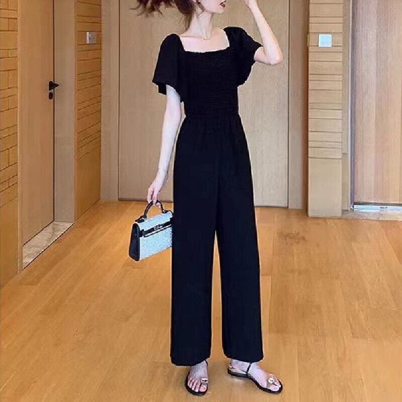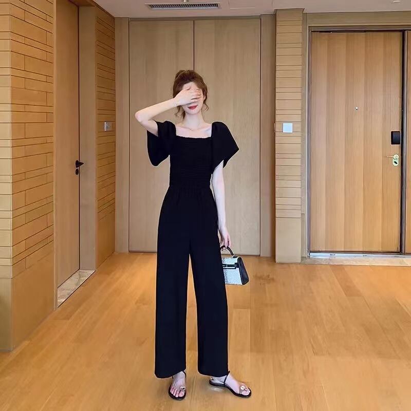ブラック無地パフスリーブワイドレッグパンツオールインワン·サロペット【DL-2982】