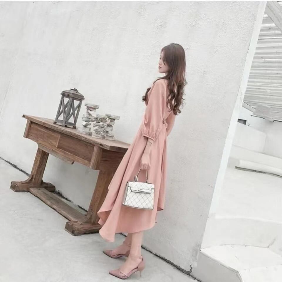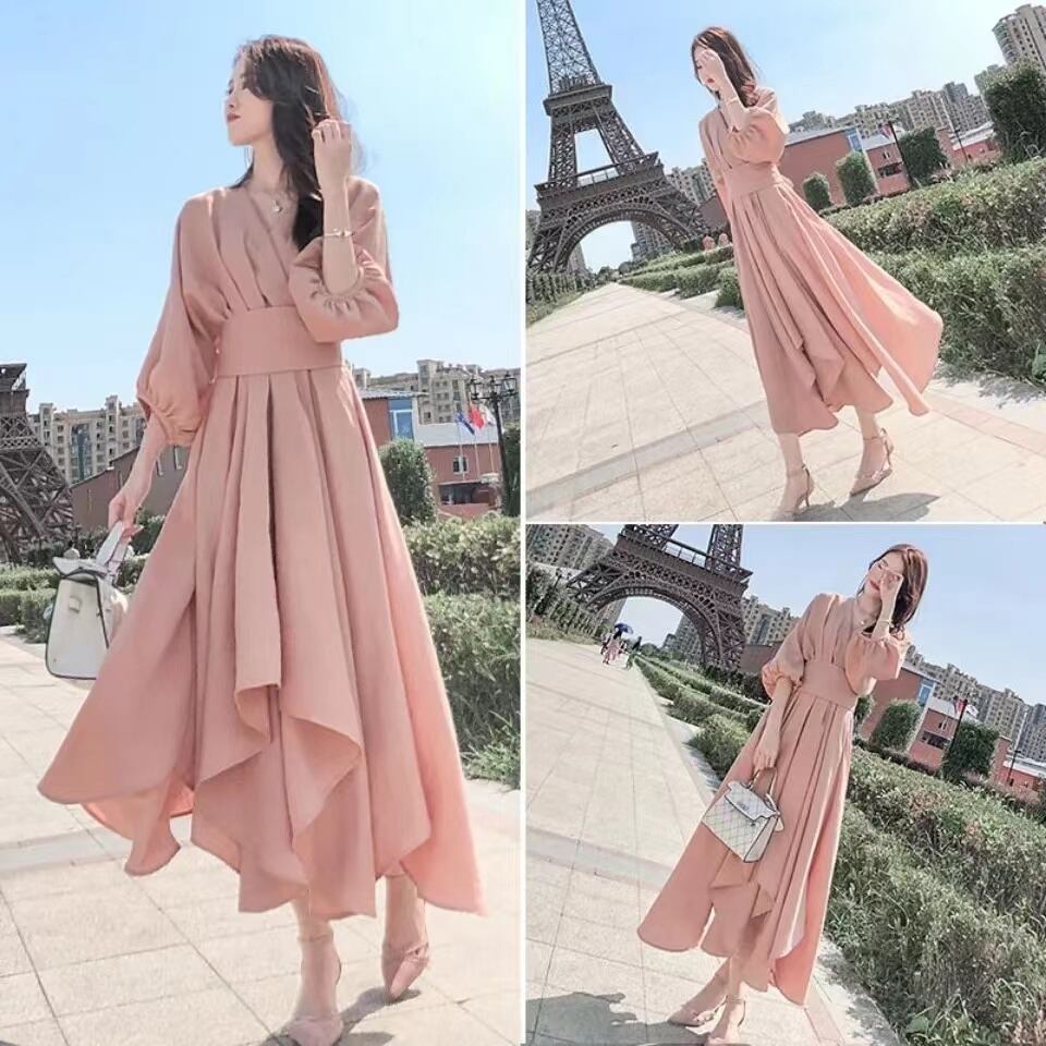 ピンク無地気質着痩せ効果ロングデートワンピース【DL-3024】