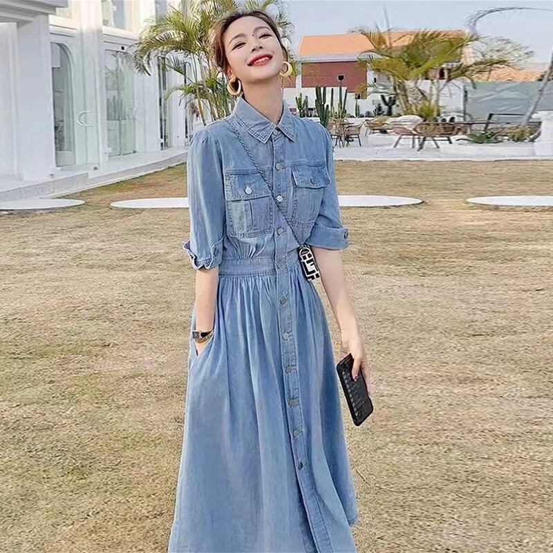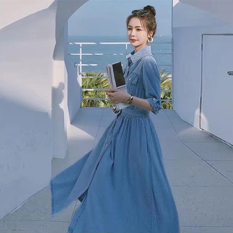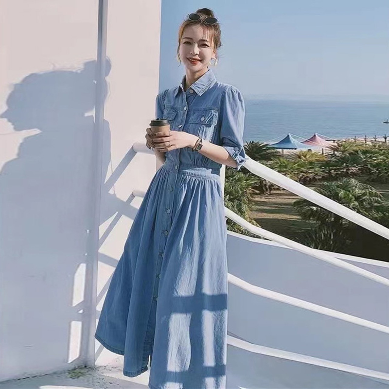 優しい気質レトロデザインデニムロングデートワンピース【DL-3026】
