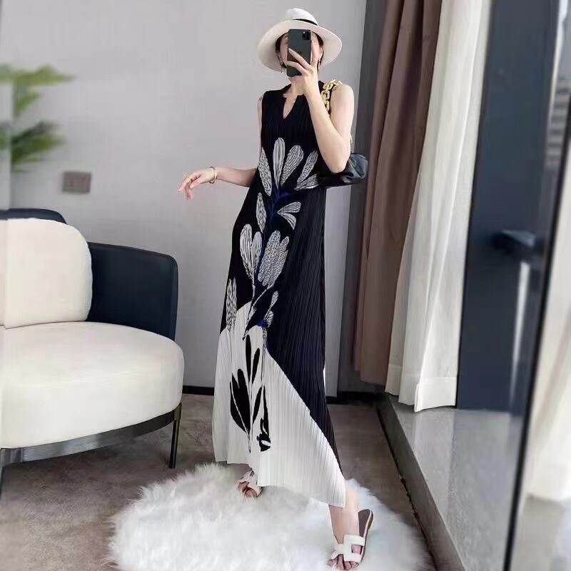花柄配色切り替え無袖ロングカジュアルワンピース【DL-3029】