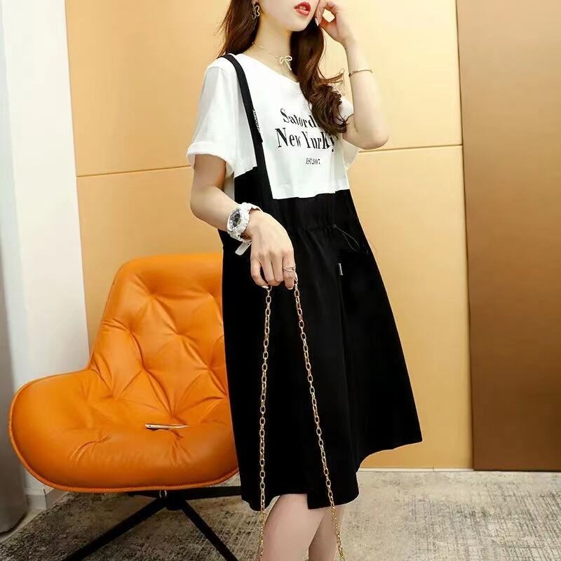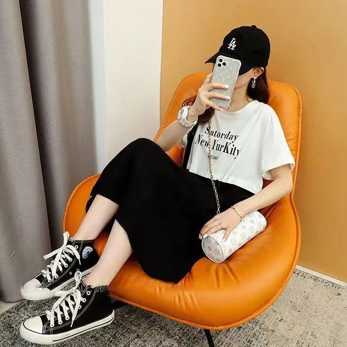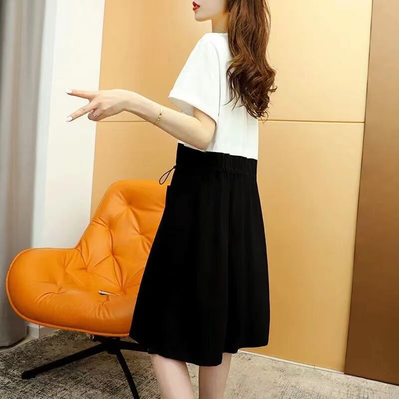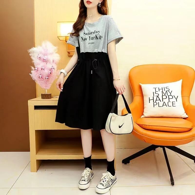 字母プリントラウンドネック半袖ロングデートワンピース【DL-3033】