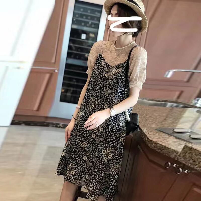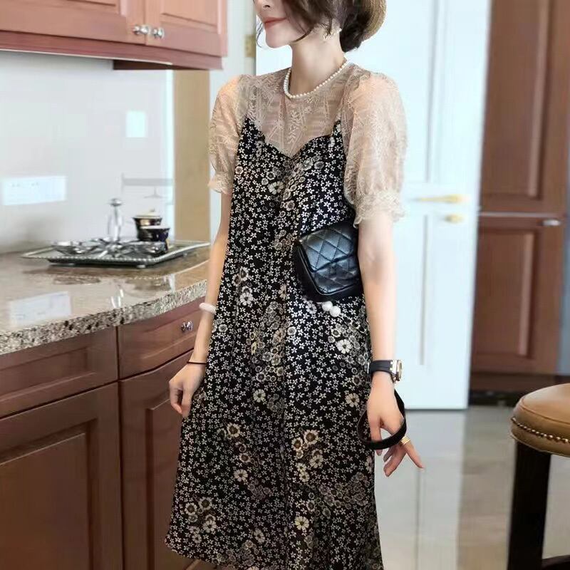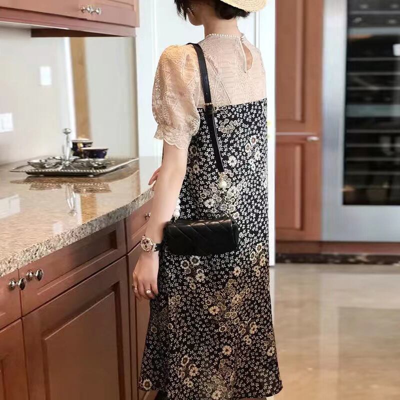 花柄パフスリープ半袖配色切り替えデザインスタイルカジュアルワンピース【DL-3034】