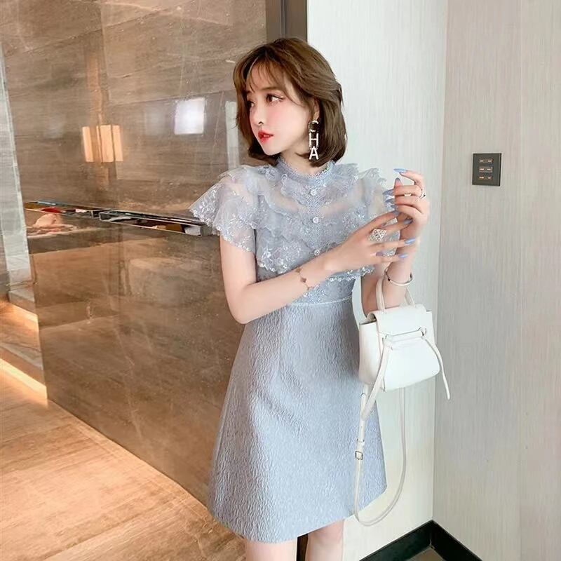フリル裾花柄レース気質着痩せ効果デートワンピース【DL-3035】