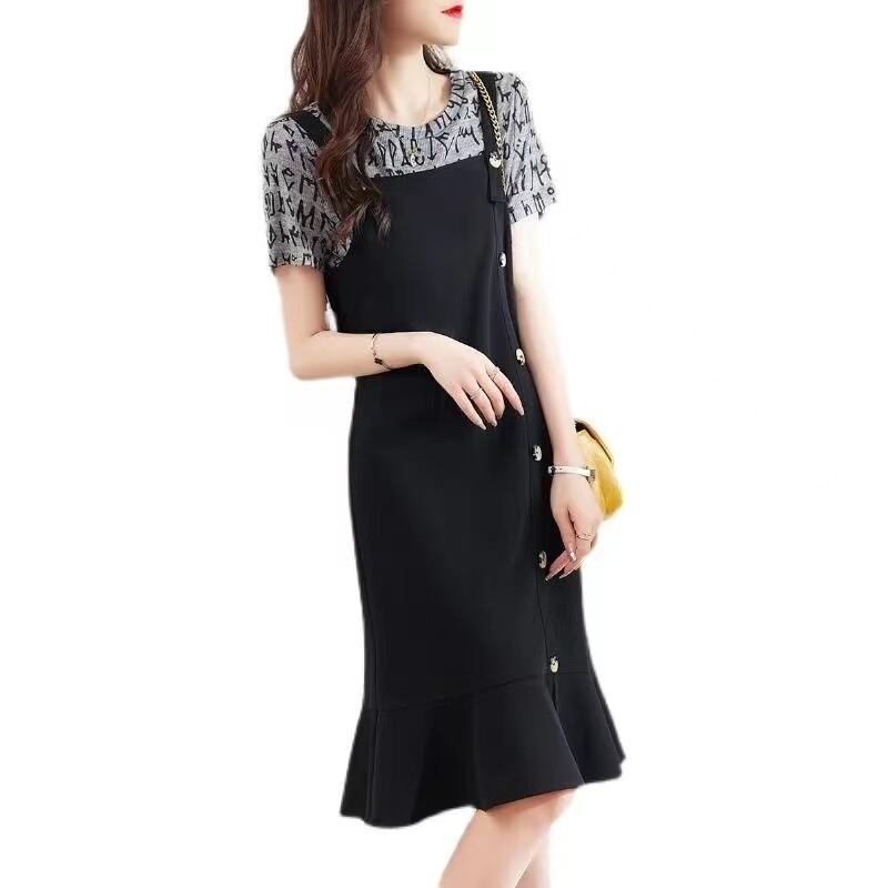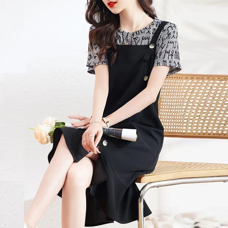 ファッション切り替えボタン付き半袖スリットカジュアルワンピース【DL-3059】