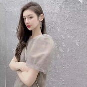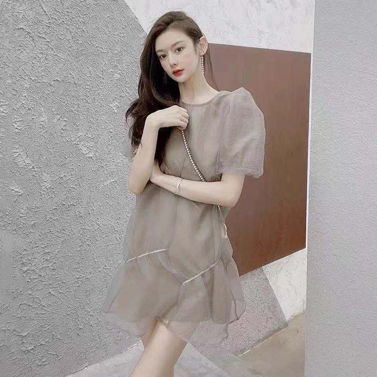 メッシュパフスリープ半袖無地カジュアルワンピース【DL-3099】